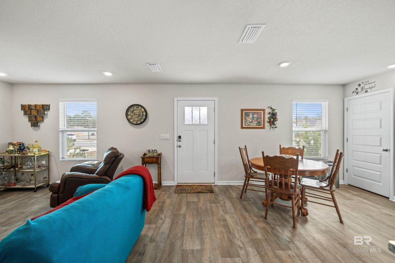 Set in the Bay Street Villages community in Foley, 1137 Sweet Laurel St offers a newer home option with easy access to both daily conveniences and local attractions. Located just minutes from downtown Foley, you'll be close to parks, schools, the hospital, dining, and shopping, including Tanger Outlets. Entertainment at OWA is nearby, and the beach is just a short drive away when you want to spend time on the coast. Built in 2024 by D.R. Horton, this Gold Fortified home features 3 bedrooms, 2 bathrooms, and approximately 1,205 square feet of living space. Vinyl flooring and granite countertops run throughout the home. The open living area connects seamlessly to the kitchen/dining combo with stainless steel appliances and a practical layout for everyday living. The primary bedroom includes an ensuite bathroom with a walk-in closet, single vanity, shower, and linen closet. Two additional bedrooms share a full bathroom. Outside, the partially fenced backyard looks out over a pond, creating a calm outdoor setting, while additional features include a utility closet for washer and dryer, two parking spots in front of the home, and well-maintained landscaping. Buyer to verify all information during due diligence.