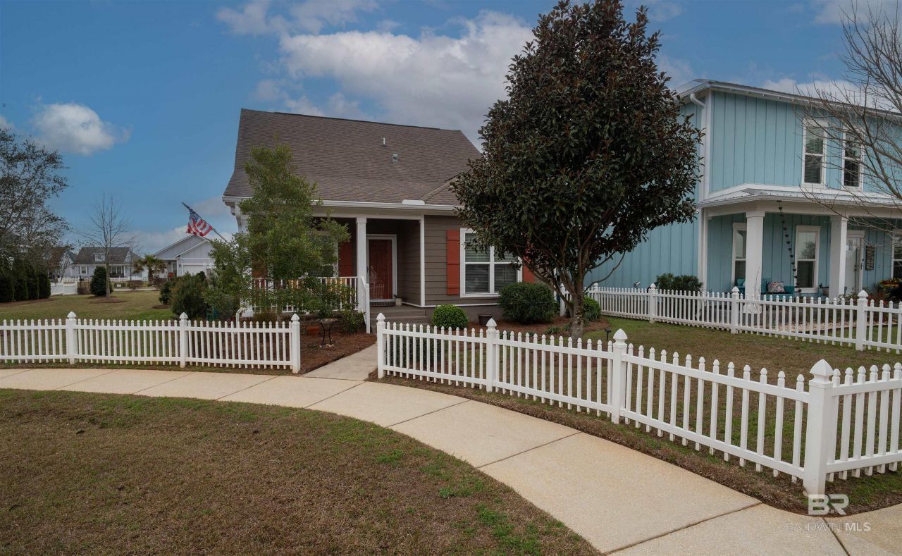 Welcome home to this adorable GOLD FORTIFIED cottage on a spacious double lot in the gated community of Cottages on the Greene. Relax on the front or side porch while taking in the charm of the manicured yard and mature landscaping. Step inside to discover open-concept living, dining, and kitchen areas designed for easy, comfortable living. The primary suite with ensuite and a guest bedroom with a full bath are conveniently located on the main level, while two additional bedrooms and a full bath upstairs provide space and privacy for everyone. Recent updates include 2 HVAC units (2022) and Irrigation System (2025). You'll love the community amenities, including a lake, pool, clubhouse, and exercise room. Conveniently located close to shopping and dining, and less than 30 minutes from the sugar-white beaches of Gulf Shores, Alabama, this cottage is the perfect place to call HOME! Buyer to verify all information during due diligence.