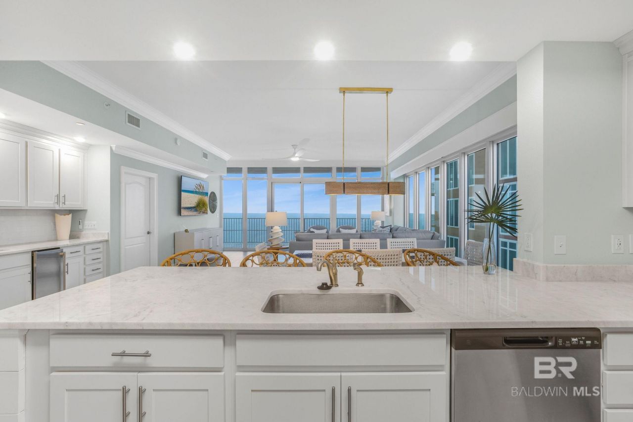 This stunning four-bedroom, four-bath condo on the 19th floor offers amazing direct gulf front views. It has been meticulously redesigned and upgraded. Highlights include an additional fourth bathroom and a revamped master bathroom. Unit 1908 features an open-concept layout with floor-to-ceiling windows and lofty 10-foot ceilings, bathing the space in natural light. The kitchen boasts granite countertops, stainless steel appliances, including a refrigerator with an ice maker, and full-height cabinets. The unit also features large tile flooring throughout, large crown molding, upgraded fixtures, and raised electrical. The Gulf-front master bedroom offers breathtaking views, while the wet bar with stainless steel appliances and a large private balcony add to the unit's luxury. The building itself is constructed with poured-in-place, solid concrete for enhanced durability. Buyer to verify all information during due diligence.