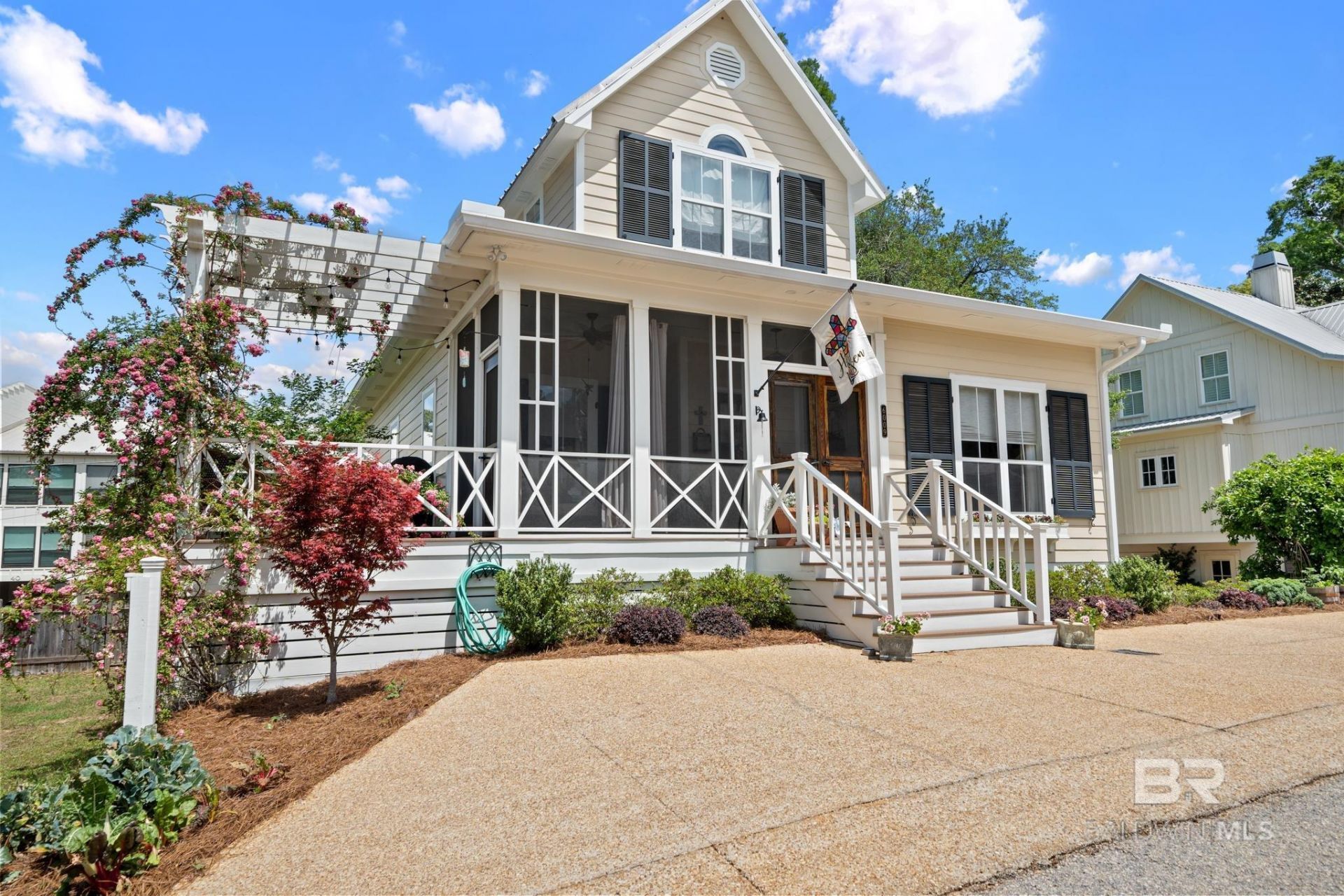 Located by the shores of Mobile Bay, this lovely, three-story, traditional cottage o?ers the perfect blend of charm, comfort, and coastal living. A short stroll out the front door leads you to the Bay Place pier where your private boat slip is located and where you can also view stunning sunsets, fish for trout, flounder and redfish and gather with friends and family on the community gazebo. In a matter of minutes, you can be at the shops, restaurants, and activities of both downtown Fairhope and quaint Point Clear. Enjoy peaceful walks along the bay to the Fairhope pier and park, taking in the beauty of this sought after location. Entering the main level through the screened porch, you'll find an open floor plan featuring a large living room with high ceilings, rich wood floors, and a cozy wood burning fireplace - the perfect space for relaxing and entertaining. The beautiful designed kitchen boasts a large island overlooking the living area, stainless appliances including a gas range, and custom cabinetry with ample storage. Enjoy views of Mobile Bay and the 'bay breeze from the porch and adjoining deck. The primary suite, located on the main level, o?ers a private retreat with easy access to the main living areas. Upstairs you'll find two additional bedrooms and a full bath, providing comfortable accommodations for family and guests. The lower level two-car garage and extra storage are accessed by a shared drive. Enter through the garage to a spacious bonus room and bath. This room has multiple uses including a 4th bedroom, o?ce, or media room. As part of the Bay Place Homeowners' Association, residents enjoy the convenience of a well-maintained community including the private pier, gazebo, bulkhead, fencing, and private drive. This is your opportunity to experience the best of Fairhope living! Buyer to verify all information during due diligence.