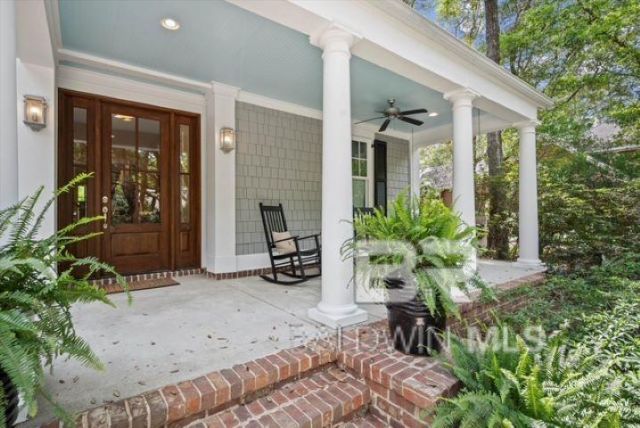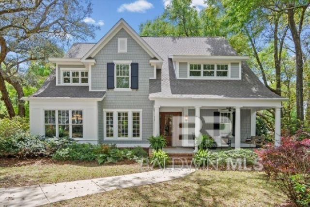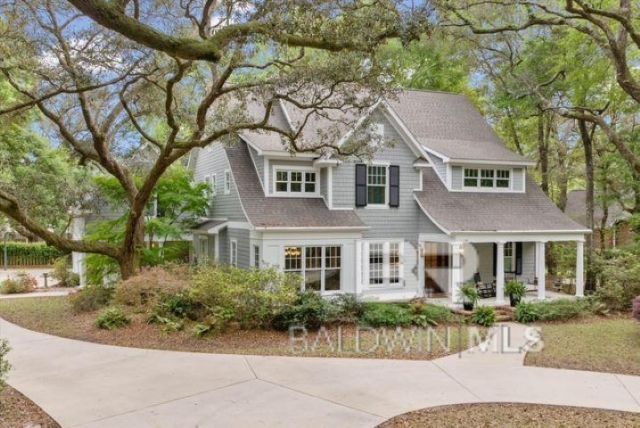 Charming New England coastal cottage style home located in the gated community of Point Clear Woods, nestled among mature live oaks and Spanish moss. This architect-designed residence blends timeless coastal elegance with refined modern luxury. Offering exceptional craftsmanship, curated details throughout. This 5br 4.5ba residence also offers abundant natural light, spacious living areas, and timeless finishes. The thoughtfully designed floor plan features multiple living and entertaining spaces, including a gourmet kitchen with high-end appliances, large island, and eat-in dining, as well as a media/playroom, formal living, formal dining room and a private office/in-law suite with separate entrance provide flexibility and privacy for guests and family. The primary suite provides a luxurious retreat with a spa-like bath and spacious closet. While additional bedrooms offer ample space and storage. Interior highlights include hardwood floors, fireplace, surround sound, central vacuum system, and extensive built-ins. Upstairs bedroom has a bathroom that is plumbed out for a possible 5th bathroom. Outdoor living is equally impressive with deep front and back porches, outdoor speakers, gas grill, brick patio with fire pit, and a fully fenced yard with irrigation system and dedicated pet area. Additional features include a three-car garage, tankless water heaters, and a security system. Buyer to verify all information during due diligence.